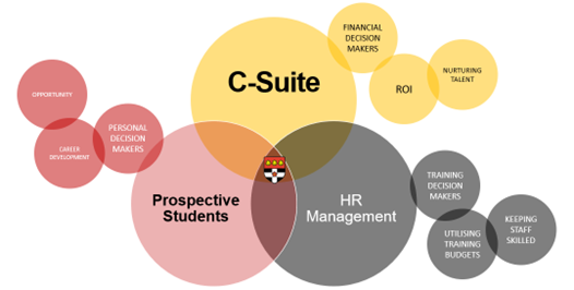 We selected 200 target companies made up from the following sectors: finance, health, IT-Telecoms, utilities (plus other/large employers – various sectors) and within those C-Suite, Prospective Students and HR Management.