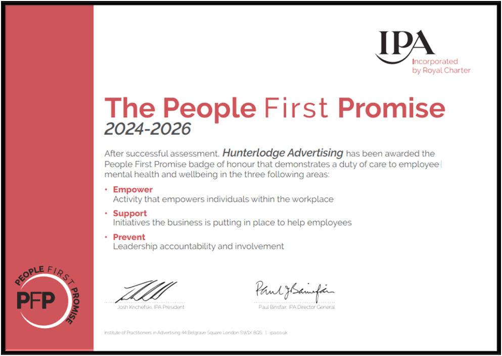 Hunterlodge Advertising has recently received the new and prestigious People First Promise badge of honour from the Institute of Practitioners in Advertising (IPA). This recognition underscores the agency’s commitment to prioritising the mental health and wellbeing of its workforce, setting a standard for the advertising industry.